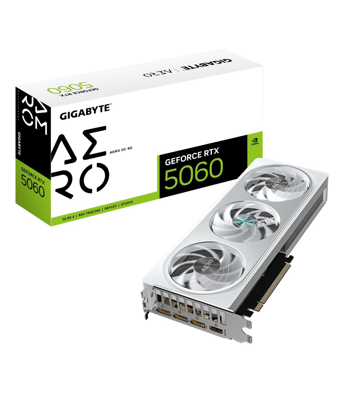 GIGABYTE GeForce RTX 5060 AERO OC 8G Tarjeta Gráfica - 8GB GDDR7, 128bit, PCI-E 5.0, 2595 MHz Frecuencia del núcleo, 3 x DisplayPort, 1 x HDMI, GV-N5060AERO OC-8GD. Familia de procesadores de gráficos: NVIDIA, Procesador gráfico: GeForce RTX 5060, Frecuencia del procesador: 2595 MHz. Capacidad memoria de adaptador gráfico: 8 GB, Tipo de memoria de adaptador gráfico: GDDR7, Ancho de datos: 128 bit, Velocidad de memoria del reloj: 28000 MHz. Máxima resolución: 7680 x 4320 Pixeles. Versión DirectX: 12.0, Versión OpenGL: 4.6. Tipo de interfaz: PCI Express 5.0. Tipo de enfriamiento: Activo, Número de ventiladores: 3 Ventilador(es), Iluminación de color: Multi