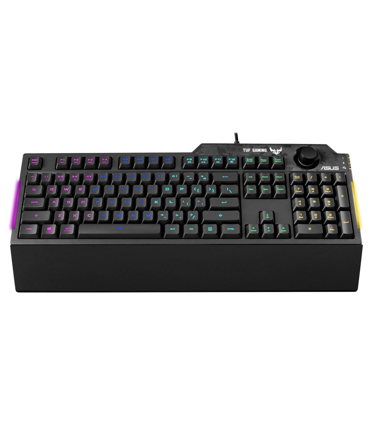ASUS TUF Gaming K1. Formato del teclado: Completo (100%). Estilo de teclado: Derecho. Tecnología de conectividad: Alámbrico, Interfaz del dispositivo: USB, Interruptor del teclado: Interruptor de membrana. Tipo de retroiluminación: LED RGB, Descansa muñecas. Longitud de cable: 1,8 m. Uso recomendado: Juego. Color del producto: Negro