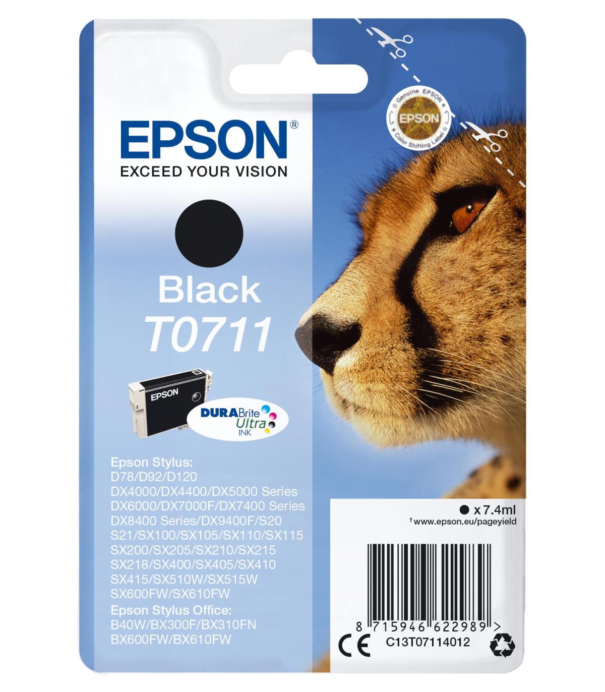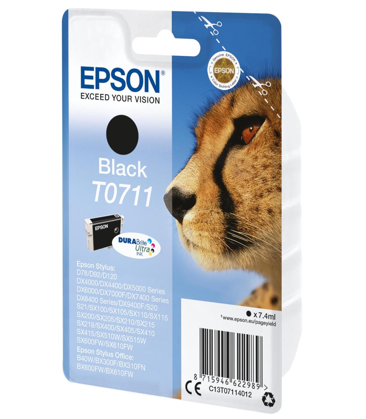 Epson Cheetah Cartucho T0711 negro. Tipo de cartucho de tinta: Rendimiento estándar, Tipo de tinta negra: Tinta a base de pigmentos, Volumen de tinta negra: 7,4 ml, Colores de impresión: Negro, Cantidad por paquete: 1 pieza(s)
