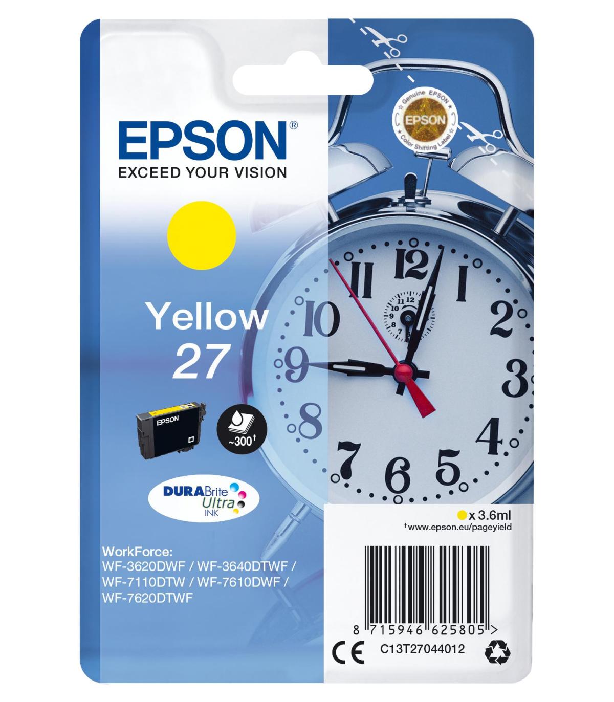 Epson Alarm clock Singlepack Yellow 27 DURABrite Ultra Ink, Rendimiento estándar, Amarillo, Tinta a base de pigmentos, 3,6 ml, 1 pieza(s), 300 páginas