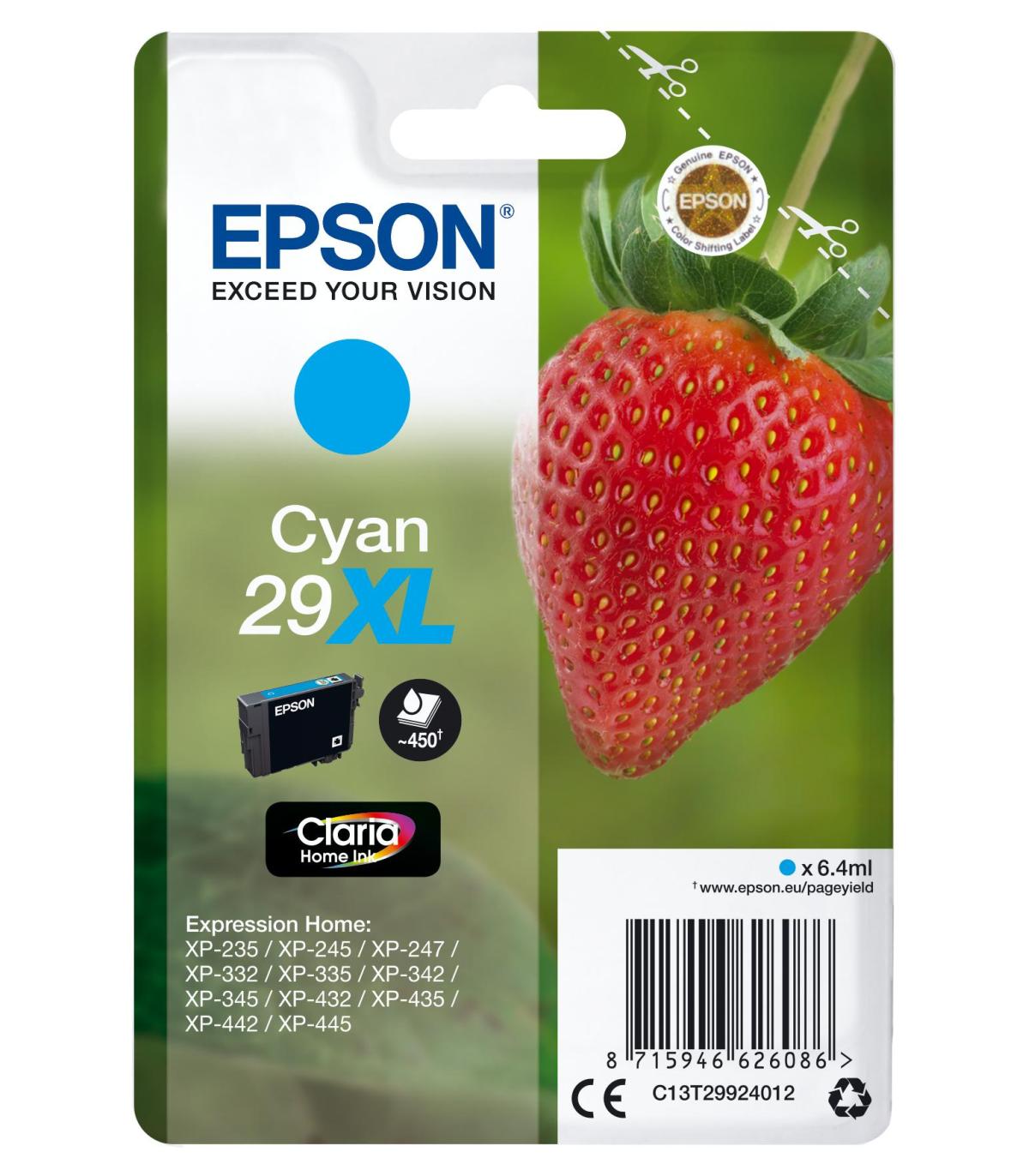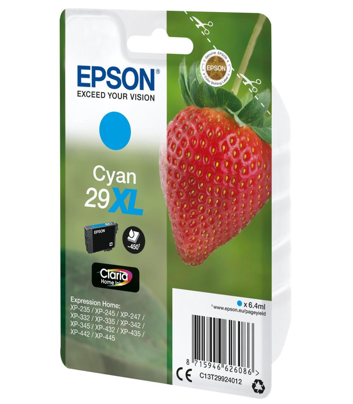 Epson Strawberry Singlepack Cyan 29XL Claria Home Ink. Tipo de cartucho de tinta: Alto rendimiento (XL), Rendimiento de impresión de página con tinta de color: 450 páginas, Volumen de tinta de color: 6,4 ml, Colores de impresión: Cian, Cantidad por paquete: 1 pieza(s)