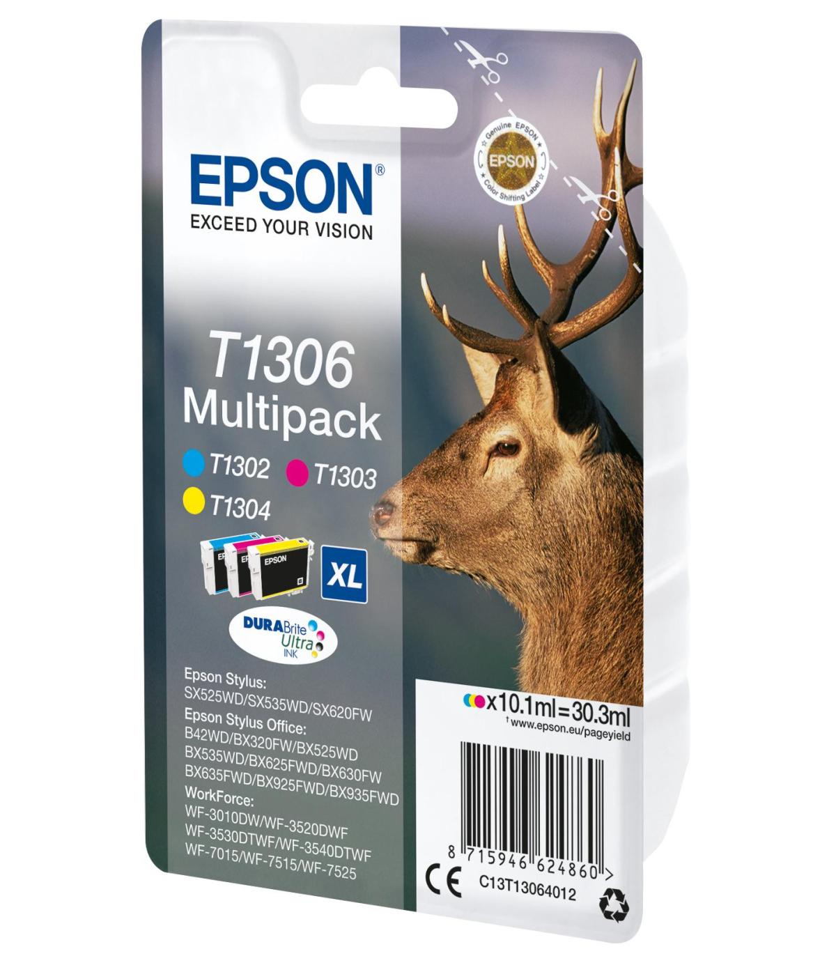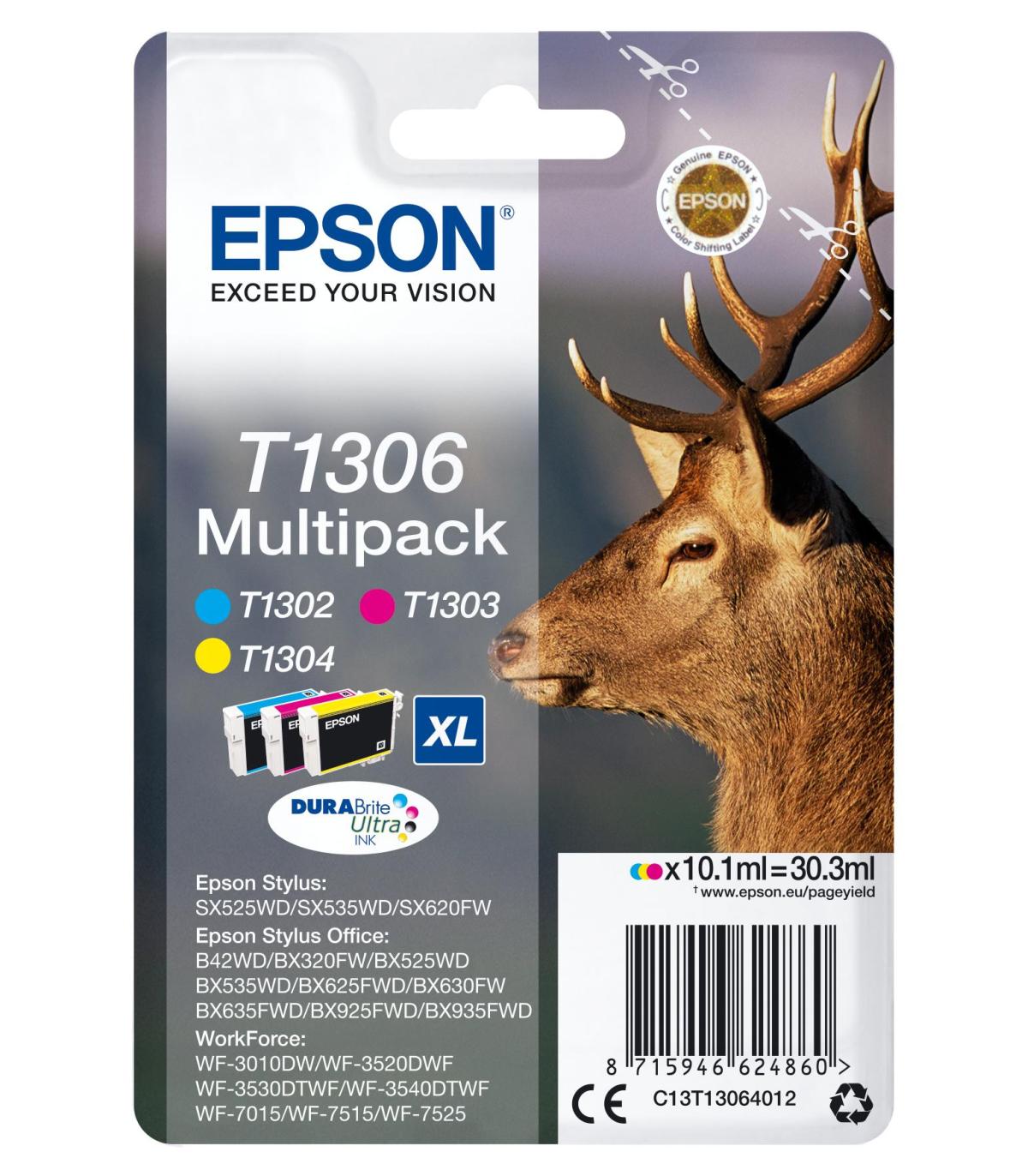 Epson Stag Multipack T1306 3 colores. Tipo de tinta de color: Tinta a base de pigmentos, Tipo de cartucho de tinta: Alto rendimiento (XL), Tipo de suministro: Multipack, Volumen de tinta de color: 10,1 ml, Colores de impresión: Cian, Magenta, Amarillo, Cantidad por paquete: 1 pieza(s)