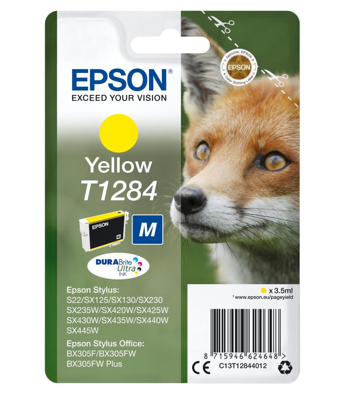 Epson Fox Cartucho T1284 amarillo. Tipo de tinta de color: Tinta a base de pigmentos, Rendimiento de impresión de página con tinta de color: 260 páginas, Volumen de tinta de color: 3,5 ml, Colores de impresión: Amarillo, Cantidad por paquete: 1 pieza(s)