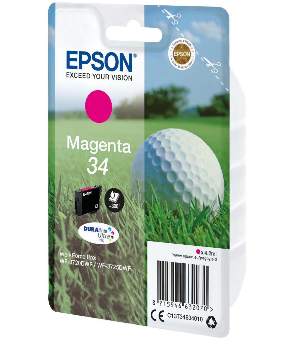Epson Golf ball Singlepack Magenta 34 DURABrite Ultra Ink. Tipo de tinta de color: Tinta a base de pigmentos, Tipo de cartucho de tinta: Rendimiento estándar, Rendimiento de impresión de página con tinta de color: 300 páginas, Volumen de tinta de color: 4,2 ml, Colores de impresión: Magenta, Cantidad por paquete: 1 pieza(s)
