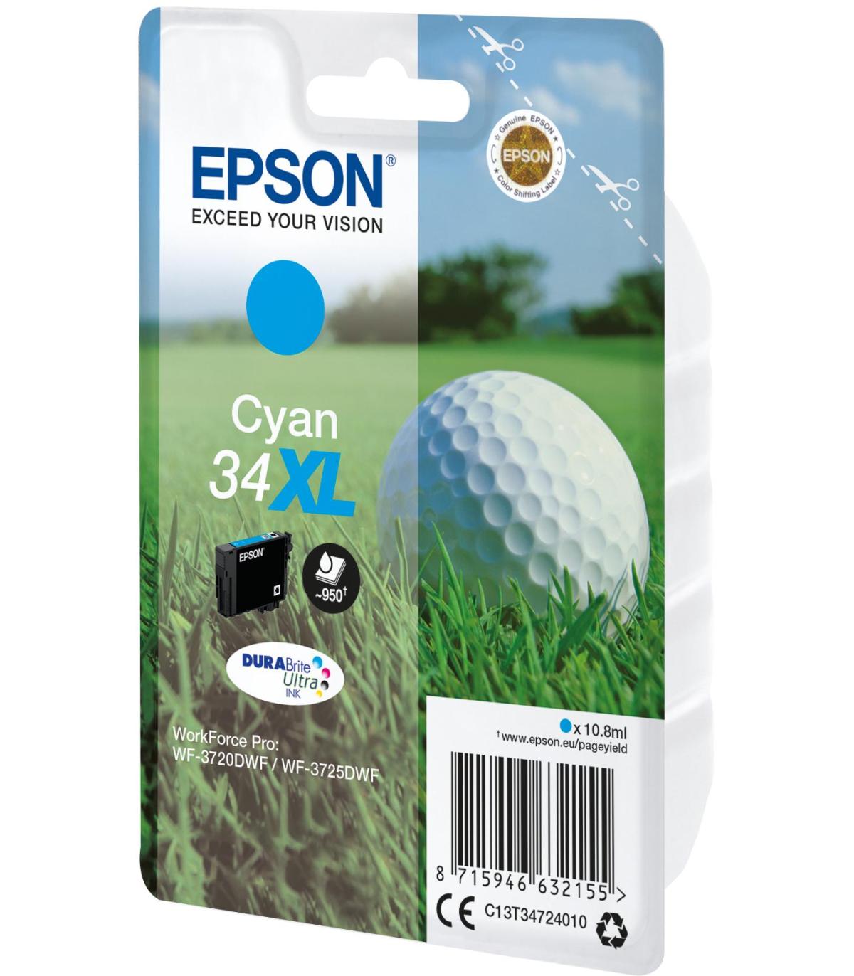 Epson Golf ball Singlepack Cyan 34XL DURABrite Ultra Ink. Tipo de cartucho de tinta: Alto rendimiento (XL), Rendimiento de impresión de página con tinta de color: 950 páginas, Volumen de tinta de color: 10,8 ml, Colores de impresión: Cian, Cantidad por paquete: 1 pieza(s)