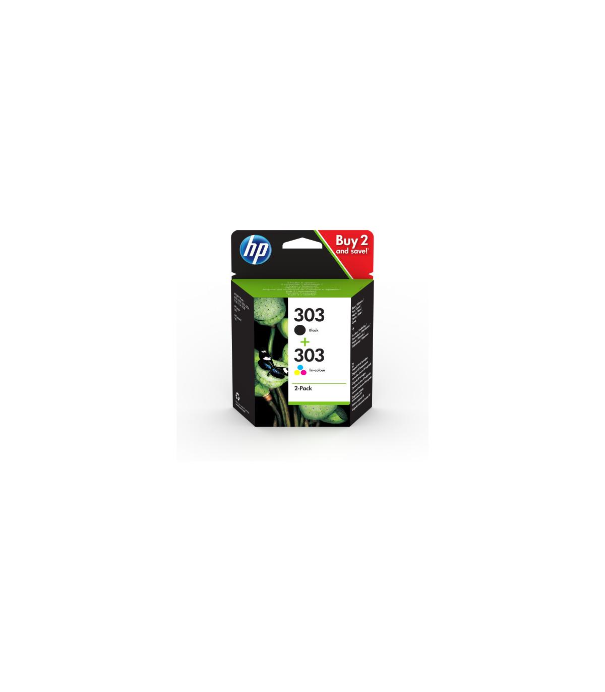 HP Paquete de 2 cartuchos de tinta Original 303 negro/tricolor. Tipo de tinta de color: Tinta a base de colorante, Tipo de cartucho de tinta: Rendimiento estándar, Tipo de tinta negra: Tinta a base de pigmentos, Volumen de tinta negra: 4 ml, Tipo de suministro: Multipack, Rendimiento de impresión de página con tinta de color: 165 páginas, Volumen de tinta de color: 4 ml, Colores de impresión: Negro, Cian, Magenta, Amarillo, Cantidad por paquete: 2 pieza(s), Rendimiento de impresión de página con tinta negra: 200 páginas