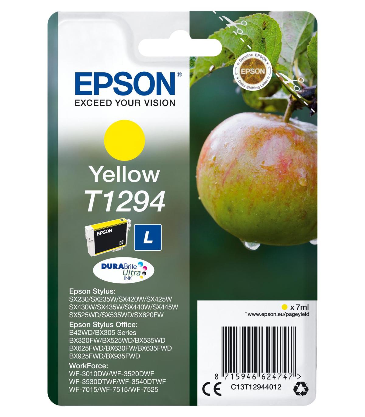 Epson Apple Cartucho T1294 amarillo. Tipo de tinta de color: Tinta a base de pigmentos, Rendimiento de impresión de página con tinta de color: 616 páginas, Volumen de tinta de color: 7 ml, Colores de impresión: Amarillo, Cantidad por paquete: 1 pieza(s)